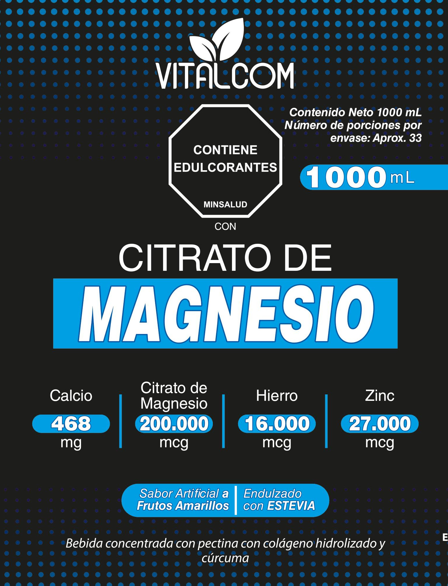 Citrato de Magnesio Líquido Vitalcom 1000 mL con Colágeno Hidrolizado, Vitaminas y Minerales