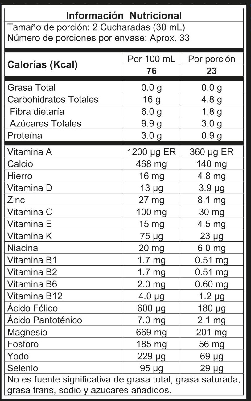 Se recomienda tomar 2 cucharadas (30 mL) al día, mezcladas en agua o bebida de preferencia.