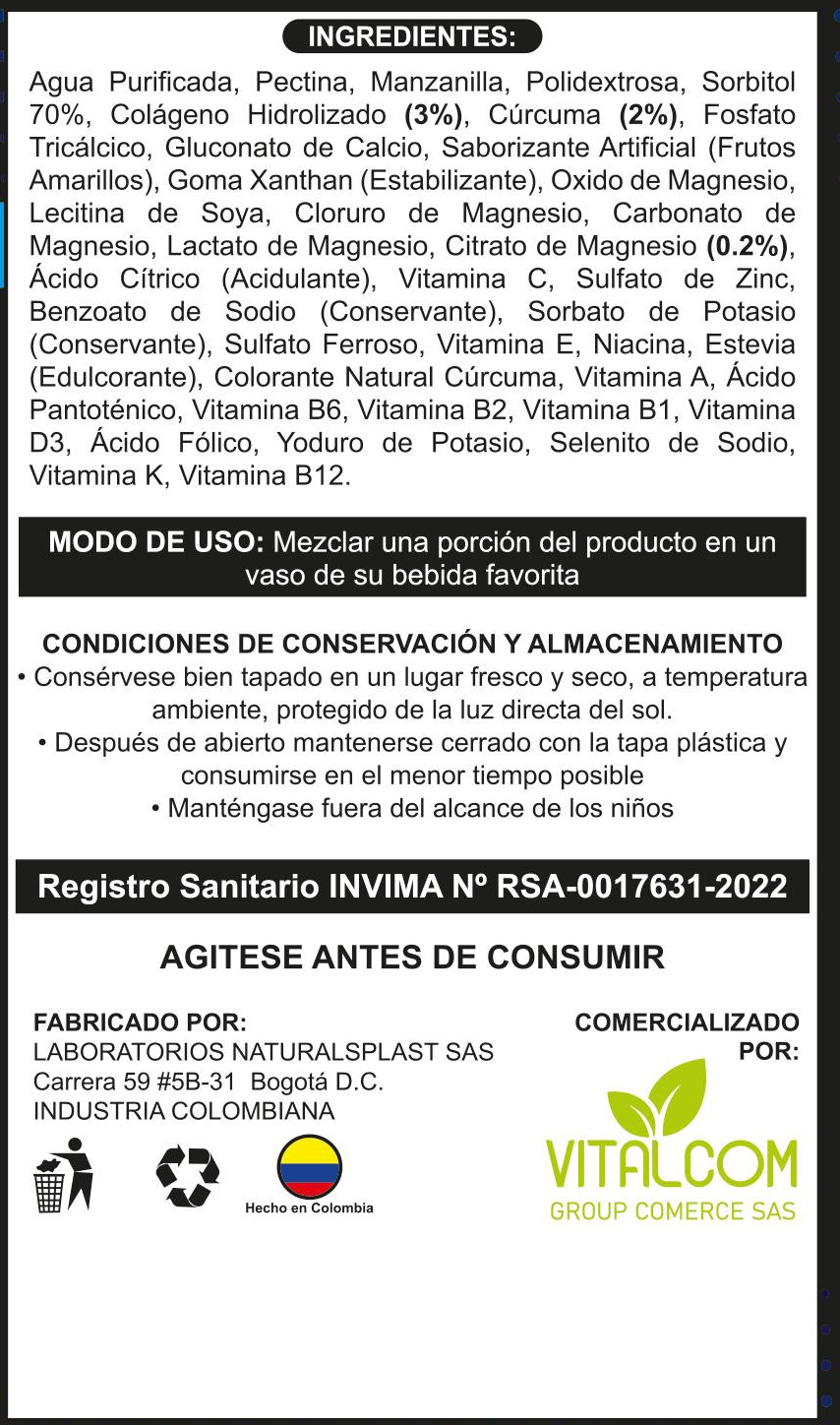 Su presentación líquida facilita la absorción y consumo, convirtiéndolo en una opción práctica para personas que buscan apoyar su bienestar general, el funcionamiento muscular y el mantenimiento de huesos y tejidos conectivos, dentro de una alimentación equilibrada.