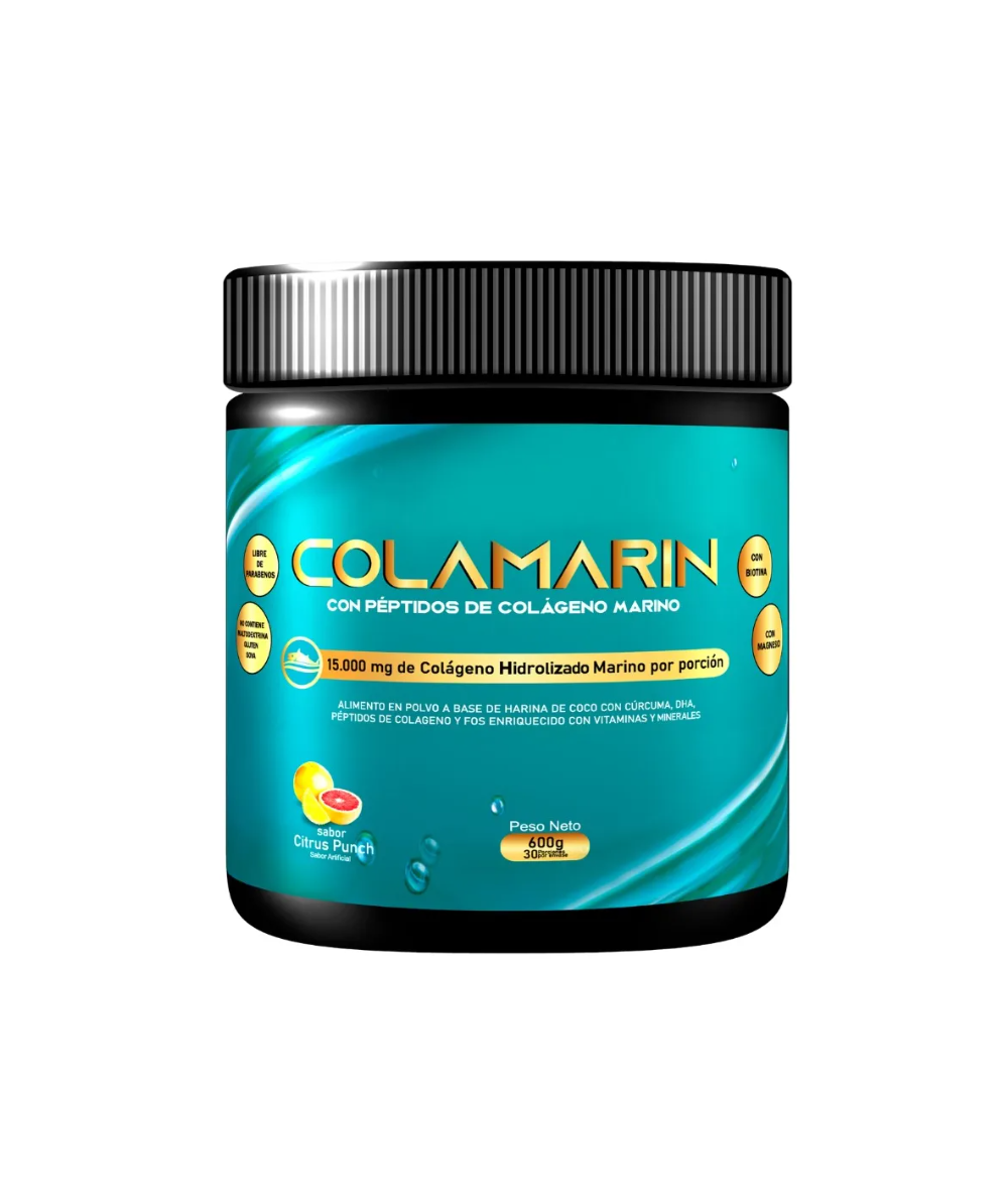 COLAMARIN ByPluss es un alimento en polvo diseñado para disolverse en agua y ser consumido como bebida diaria. Está formulado con colágeno hidrolizado marino, vitaminas, minerales esenciales, y compuestos bioactivos como biotina, DHA, y cúrcuma, que contribuyen al bienestar integral del cuerpo.