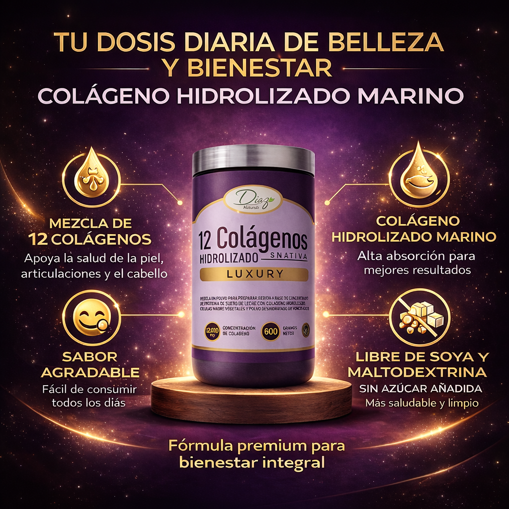El 🟣 Colágeno Hidrolizado SNATIVA Luxury Díaz Naturals es un suplemento alimenticio en polvo formulado con una combinación avanzada de 12 tipos de colágeno, vitaminas, minerales y aminoácidos esenciales que contribuyen al bienestar integral del cuerpo.