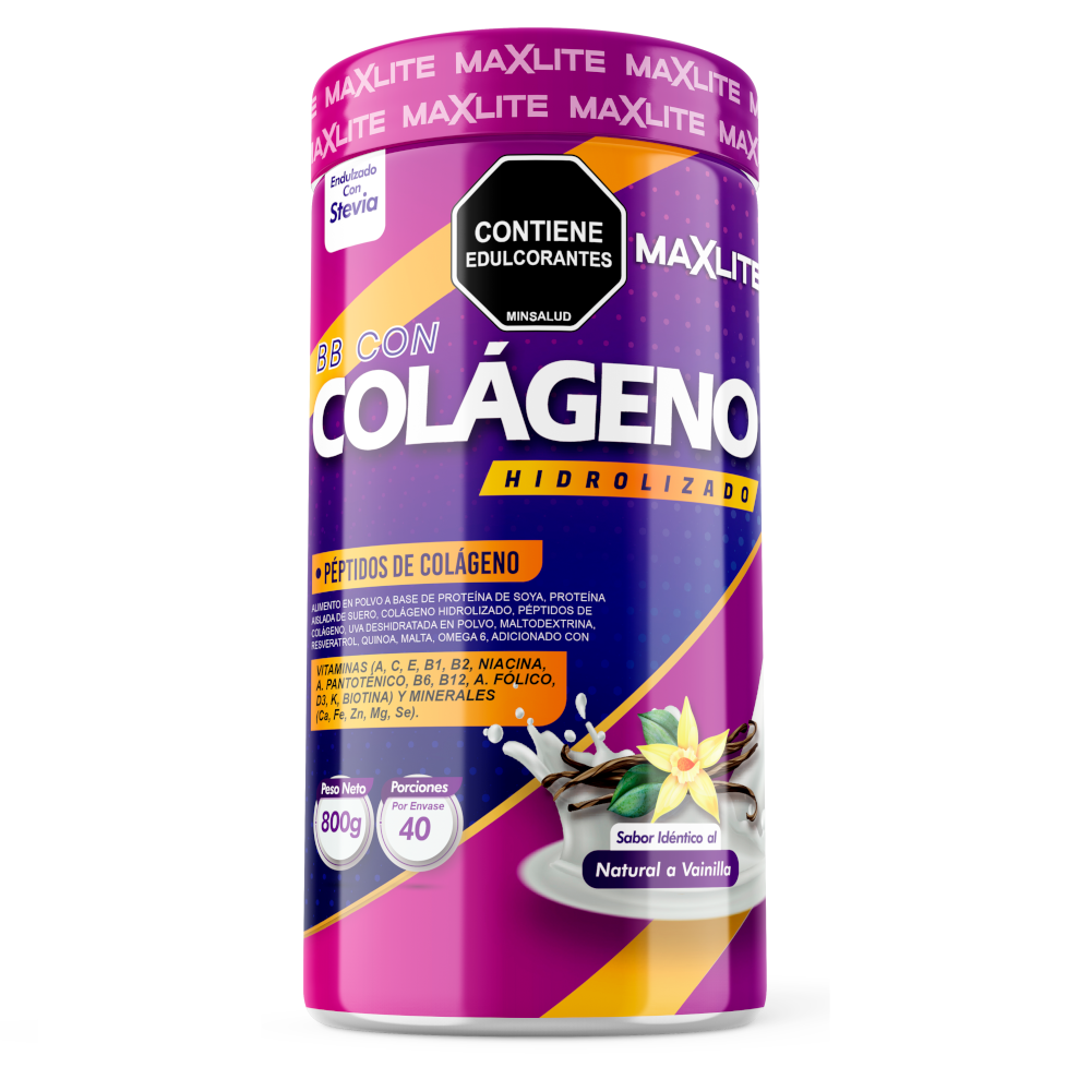MaxLite es un alimento en polvo formulado a base de proteína de soya, proteína aislada de suero, colágeno hidrolizado, péptidos de colágeno, vitaminas, minerales y antioxidantes como el resveratrol. Su mezcla está diseñada para apoyar funciones normales del organismo como la salud del tejido conectivo, piel, cabello, uñas, músculos y articulaciones, dentro de una dieta balanceada.