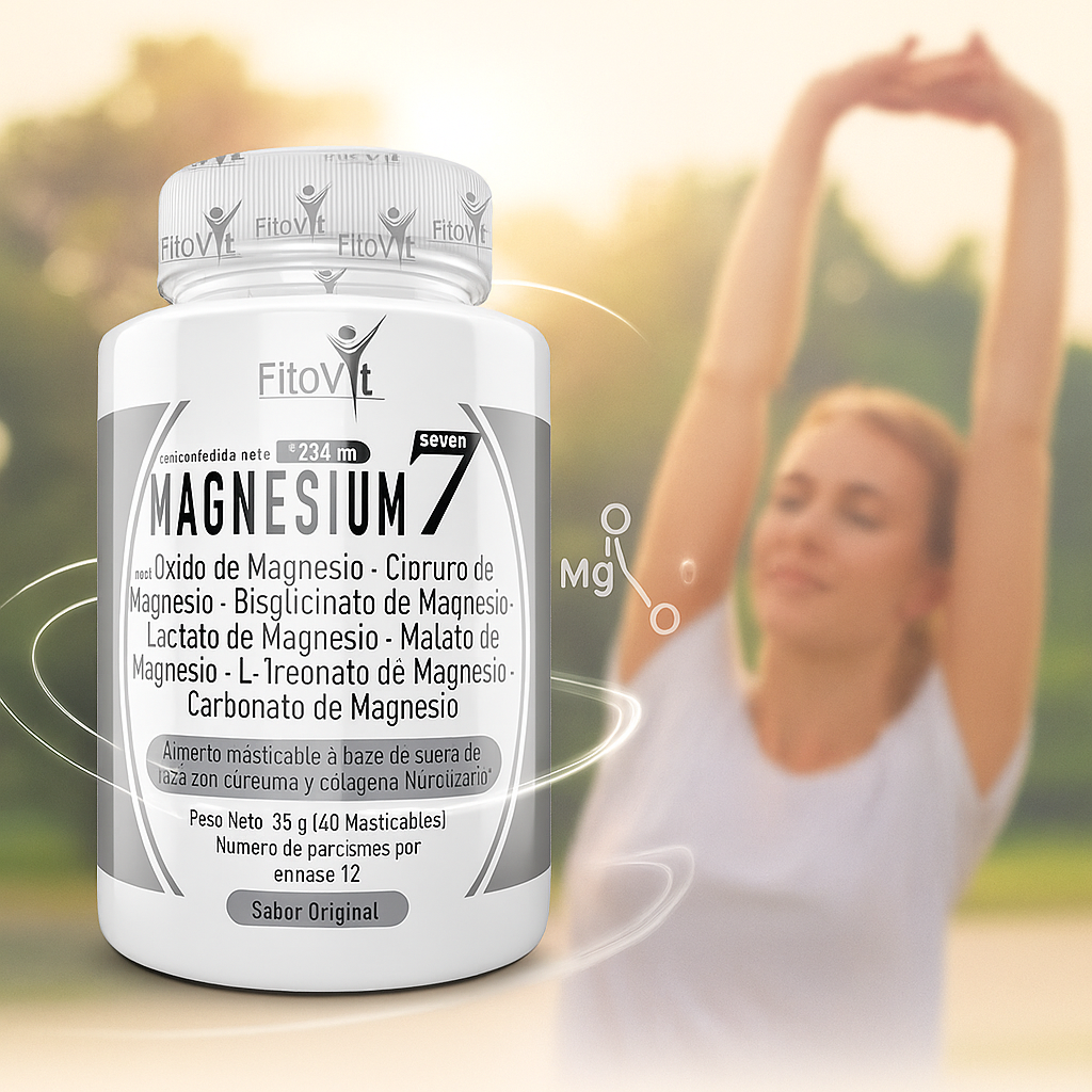 Magnesium 7 Fitovit es un alimento masticable formulado con siete tipos de magnesio biodisponible, combinados con cúrcuma y colágeno hidrolizado, que aportan un apoyo integral al bienestar físico y mental.